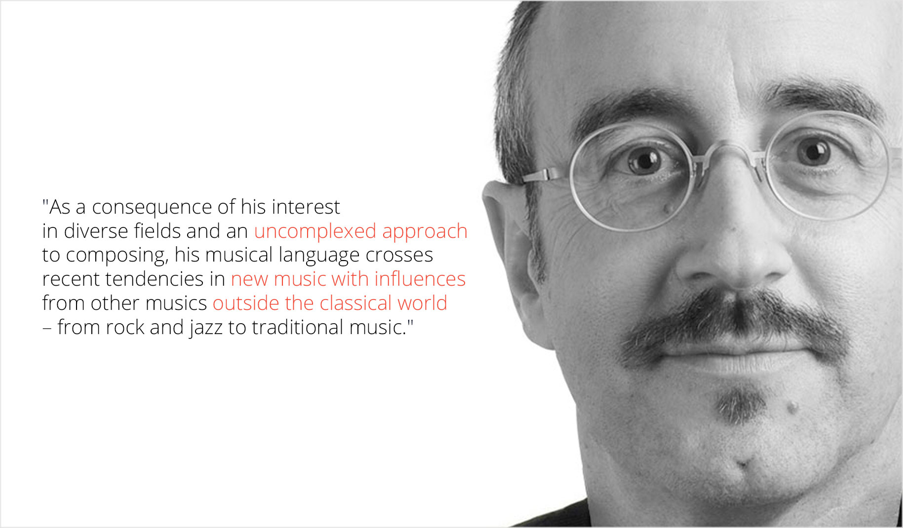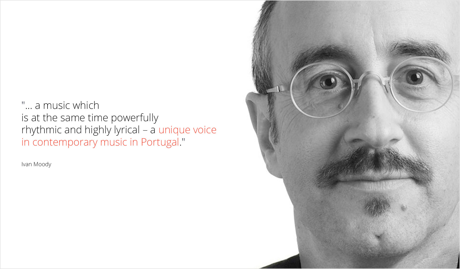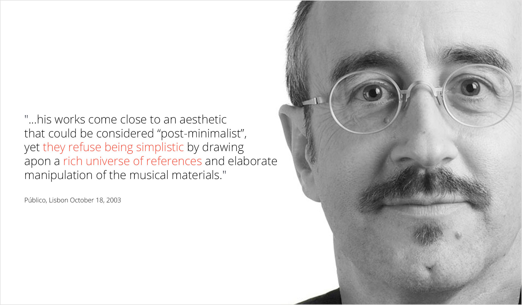 He was awarded First Prize in the 1994 Washington International Competition for Composers for his string quartet Mata Hari. His music has been performed and commissioned by the Portuguese National Ballet, American Dance Festival, Arditti Quartet, Ciompi Quartet, Chicago Ensemble, Dale Warland Singers, Ives Chamber Orchestra, Minneapolis Vocal Consort, New Jersey Percussion Ensemble, ISCM World Music Days, Schola Cantorum of Oxford, Ricercare Choir, Lacerda Quartet, Expo ’98, Cistermúsica and Gulbenkian Foundation and Nova Era Vocal Ensemble.